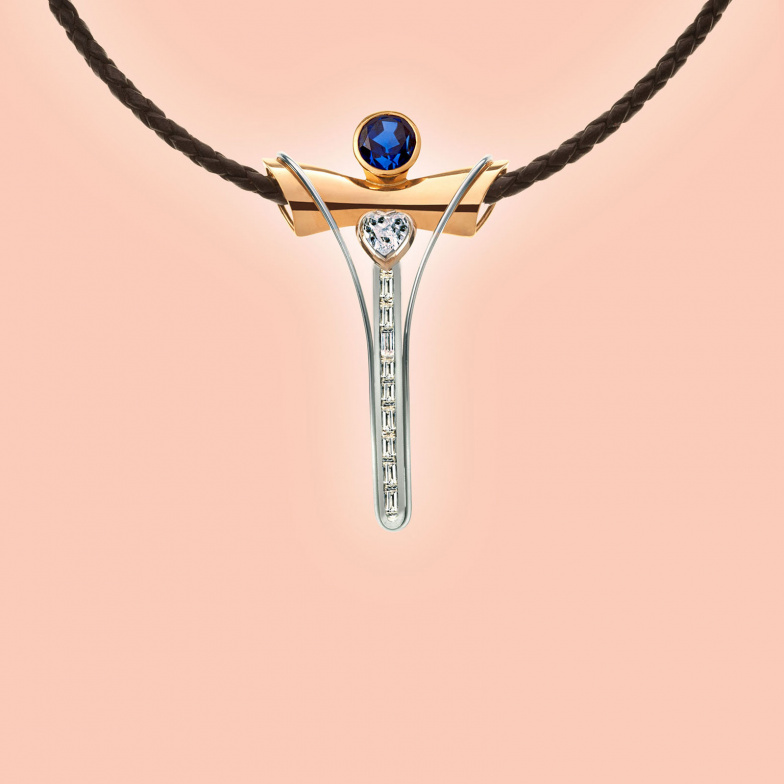 Seelenbegleiter, manifestiert in 750 feinem Roségold, verbunden mit 950 reinem Platin, gekrönt von einem strahlend, königsblauen Saphir von 3,172 ct über zehn hochfeinweißen Diamanten im Herz- und Baguetteschliff (1,43 ct).