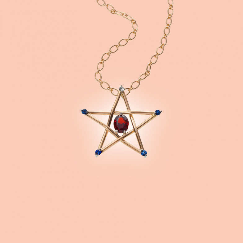 Seelenbegleiter, manifestiert in 750 feinem Roségold in Verbindung mit 950 reinem Platin, vier hochfeinen, königsblauen Safiren für die irdische Ebene und einem hochfeinweißen Brillanten für die geistig-erschaffende Ebene. Zentral ein hochfeiner Rhodolith von 3,77 ct.
